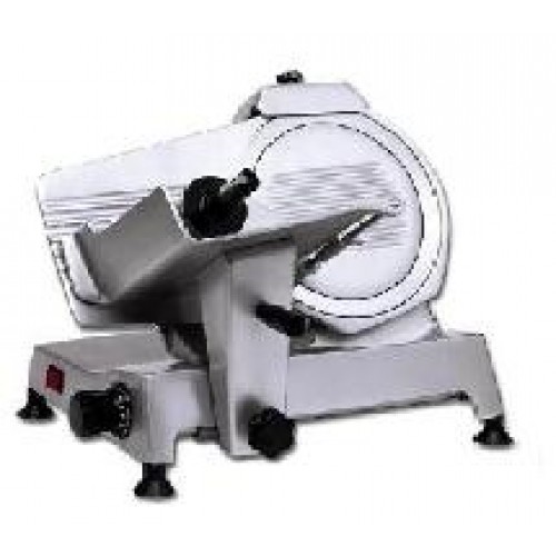 Base and main components in high polished satin finished anodized aluminium for long lasting, hygiene and ease of cleaning. The blade is in hollow ground hard chrome with blade guard ring for added protection. Model equipped with cut thickness adjusting knob, top mounted sharpener, cover blade and product deflector - easily removable for cleaning. Ventilated blade drive motor. Poly V-belt drive system for quiet operation and economical service. Removable carriage system permanently lubrificated with automatic clutch. IP42 water protection. UK plug.