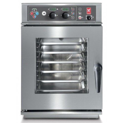 The 6 x 1/1 gastronorm compatible FCC 6S compact combination oven offers a range of features that makes it easy to produce consistently great food. Manual controls with alphanumeric display, 99 programme storage capacity (with up to 4 individual steps in each) and hand shower - this combination oven is ideal for any kitchen but with a width of only 510mm it is perfect for those with limited space. Multilevel and Just in Time cooking modes enable food items that require different cooking times to be cooked simultaneously.This model requires an additional water treatment system.